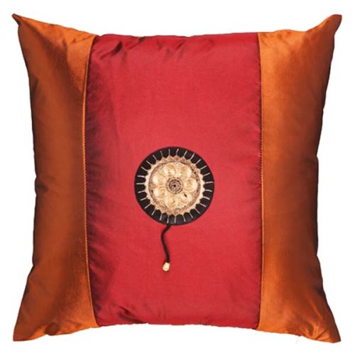 Add a unique touch of Oriental grandeur to your home when you decorate with this gorgeous cushion cover, featuring a bold and intricately embroidered gold-on-black sunflower. The central swathe of satiny crimson is bordered on two sides with shimmering bands of sumptuous rust-tone fabric. The solid rust-tone backing on the reverse side allows you to mix and match styles and colors to make a statement that is uniquely yours. A dainty strand, tipped with a bell-shaped bead complements the sunflower, enhancing the Eastern mystique of this lovely cover. Hidden in the seam is an unobtrusive full-length zipper that provides quick and easy insertion and removal of a pillow. The sturdy stitching ensures that this cushion cover will look fabulous for years to come. This stunning piece will accent any living room or bedroom with spice and elegance. Measures 16 inches wide x 16 inches high. Pillow not included. AsiaEXP scours the globe to bring you authentic handcrafted treasures by talented artisans. By shopping with us, you not only acquire an exceptional creation, you also support Asian artisans and their ancient creative traditions. The handcrafted nature of this item will produce minor differences in design and sizing. Subtle variations will occur from piece to piece, adding to the unique quality of individual items. Measurements are approximate.